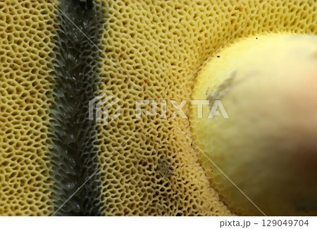 ミヤマイロガワリキノコの黄色い管孔面がアップ(自然下菌キノコ類マクロ撮影)