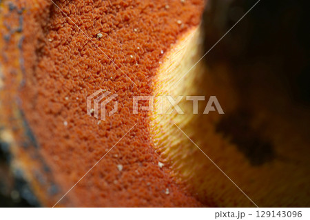 ミヤマイロガワリキノコの橙黄色の管孔部と柄(アウトドアフィールド菌&キノコ類マクロ撮影)