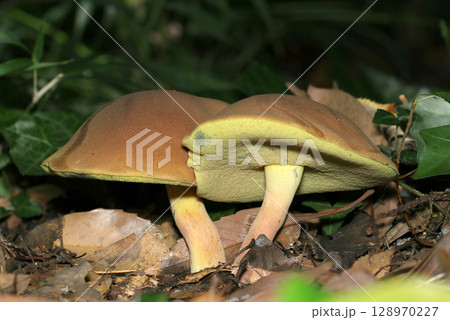 暗い雑木林土壌にどら焼きそっくりなイグチ科キノコたち(自然下菌キノコ類マクロ撮影)