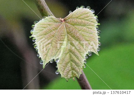 東北地方安比高原の早朝で見られたヤマブドウの若葉の先端の水孔から出た水滴が並んだ姿が綺麗です