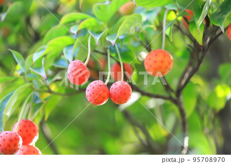 植物、写真 紅葉したヤマボウシの葉と熟して甘くなった実