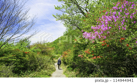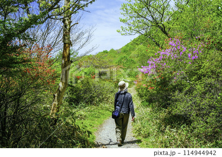 ツツジ咲く遊歩道とハイカー