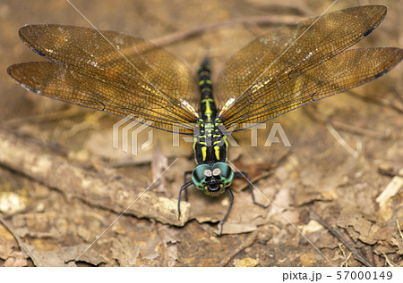 渓流沿いで休憩中のオニヤンマ。釜石、岩手、日本。9月上旬。
