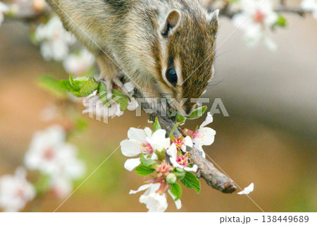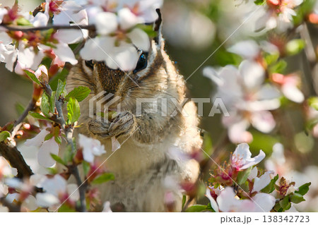 ユスラウメの花を食べるシマリス