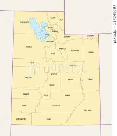 Utah, U.S. state subdivided into 29 counties, political map with borders and county names. State in the Mountain West region of Western USA. Nicknamed Beehive State, The Mormon State, and Deseret.