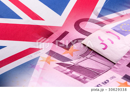 Flags of the United kingdom and euro banknotes.
