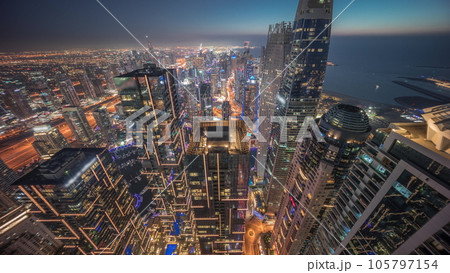Aerial view of Dubai Marina residential and office skyscrapers with waterfront night timelapse