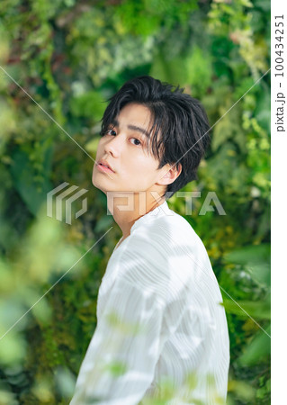 植物に囲まれた若い日本人男性のポートレート 美容 スキンケア メンズコスメ