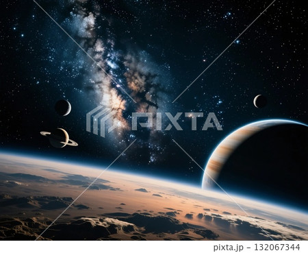 A stunning view showcases the vastness of space, highlighting distant planets and a detailed galaxy above a rocky surface. This scene captures the beauty of the cosmos Generative AI