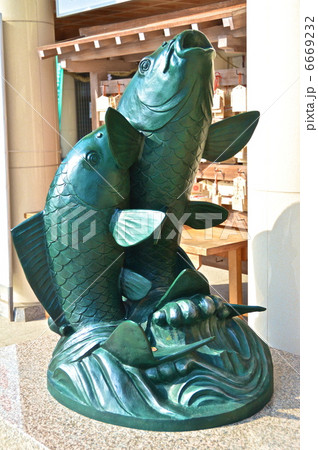 広島護国神社の本殿左脇にある「双鯉(そうり)の像」(広島城址公園/広島県広島市中区)