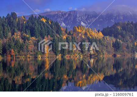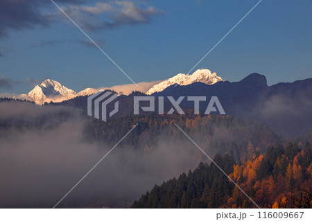スロベニア ボーヒニ湖と後ろに広がるジュリア・アルプス