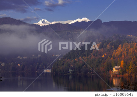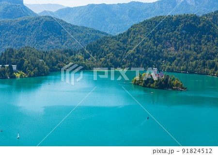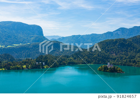 スロベニア ブレッド城から望むブレッド湖とブレッド島に建つ聖マリア教会とユリアン・アルプス