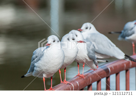 手すりの上に並ぶユリカモメ 城北公園 大阪市