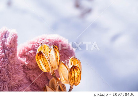 ウバユリの殻とピンク色のミトン