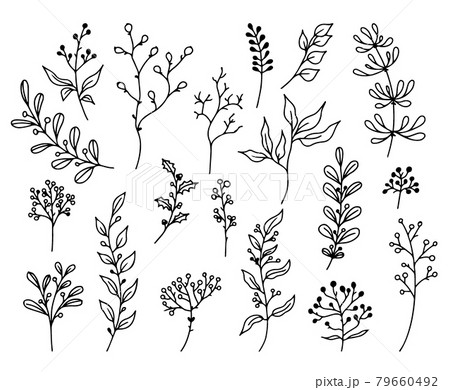 Set of hand-drawn floral elements,doodle plants and branches on a white background. Sketchy elements of design. Vector doodle illustrations.