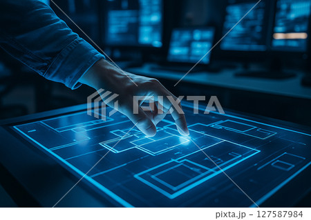AI generated image of a man hand interacting with a glowing blue digital interface displaying schematic diagrams in a high tech control lab environment with precision and focus.