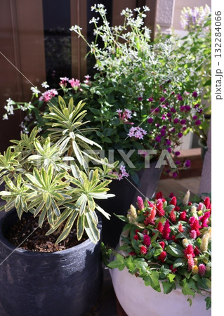 玄関前のケイトウ、ユーフォルビア、センニチコウの寄せ鉢