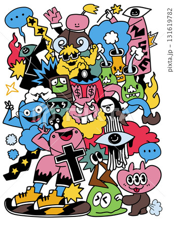 Colorful monster cartoon happy playful group doodle cute fantasy fun expressive