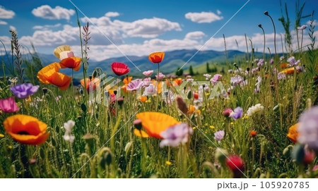 A lot of colorful poppy in the field, mountainous vistas, and a bright blue sky in the background. Generative AI