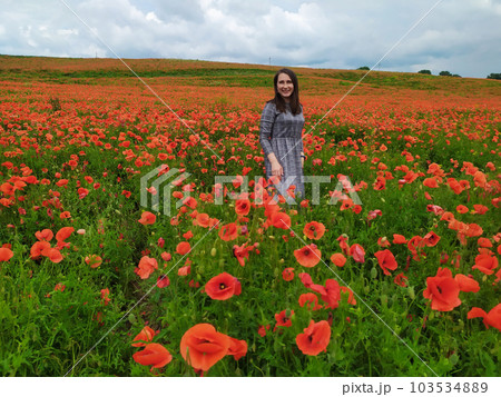 Smiling woman in a long gray dress standing on the red poppy field