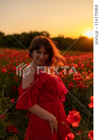 Woman poppy field red dress sunset. Happy woman in a long red dress in a beautiful large poppy field. Blond stands with her back posing on a large field of red poppies