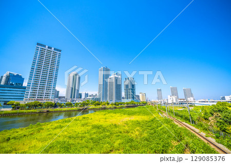 日本の横浜都市景観 みなとみらい大橋から帷子川沿いに並ぶタワーマンション群や超高層ビルなどを望む