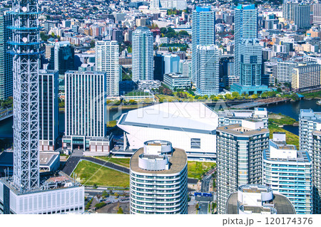 日本の横浜都市景観 連節バス(画面手前)やKアリーナ、新高島駅周辺などを望む=13日