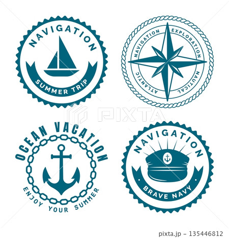 Nautical logo. Yacht club icon. Navigation compass. Old sailor. Sailing wheel badge. Navy captain hat. Sea anchor print. Ocean wave. Marine emblem design. Maritime boat. Vector vintage symbols set