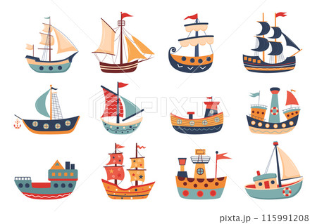 Set of cute ships, boats, yacht and sailing vessel. Nursery art scandinavian style. Childish ship collection. Marine transport clipart. Nautical theme.