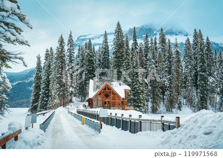 Wooden lodge on frozen Emerald Lake in pine forest on winter at Yoho national park, Canada
