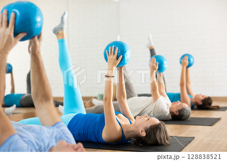 People of different ages clutching Pilates ball in hands during group workout. Active lifestyle and wellness concept