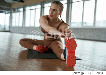 In white fitness clothes. Young caucasian woman with slim body shape is indoors in the studio