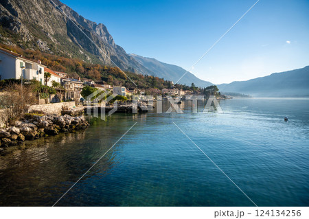 View of small village on coastline of Gulf of Kotor Bay next to Kotor town in Montenegro