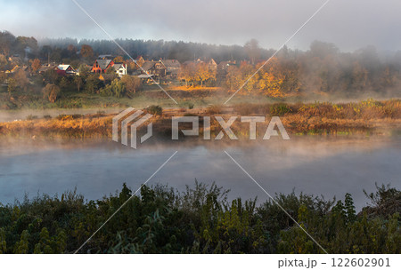 Autumn fog over the river water and colorful roofs of small town houses in the distance