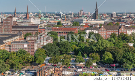 Aerial timelapse of Hamburg's historic city center skyline with iconic towers and spires. Germany
