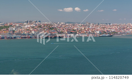 Panorama of Lisbon historical centre aerial timelapse viewed from above the southern margin of the Tagus or Tejo River.