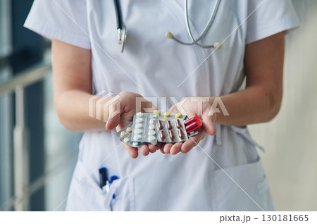 Holding prescription medicals. Female doctor in white coat is in the hall