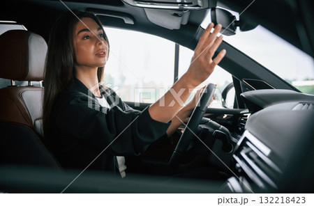 Writing by a pen. Process of buying new car, woman is signing documents while sitting in a new automobile