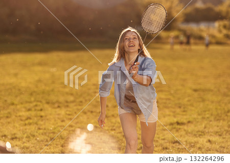 Posing, relaxed. Young skinny fitness woman is outdoors