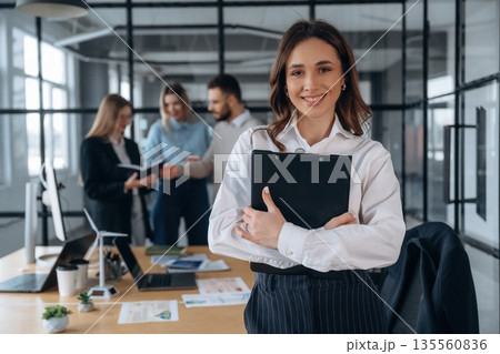 Smiling for the camera. Young beautiful woman in white clothes is in the office