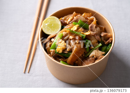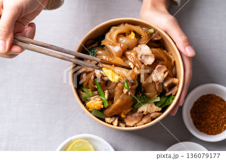 Thai food (Pad See Ew), Stir-fried rice noodles with soy sauce, pork, egg, and kale