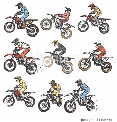 Nine motocross riders illustrated performing dirt bike stunts, wearing colorful racing gear, helmets. Riders midaction, varied stances, sporting different hues, showcasing motion, sports theme