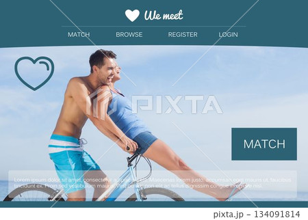Couple riding bicycle along shoreline in flat design UI with heart logo, match button, text strip