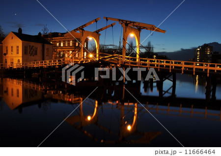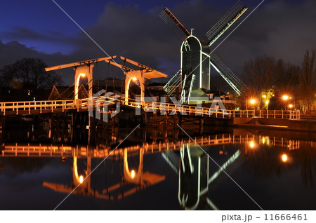 オランダ ライデンのレンブラント橋とデ・プット風車
