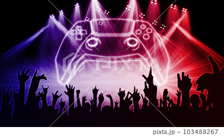 【eスポーツのイメージ】紫と緑の照明のもとコントローラを片手にエキサイト *コントローラにピント