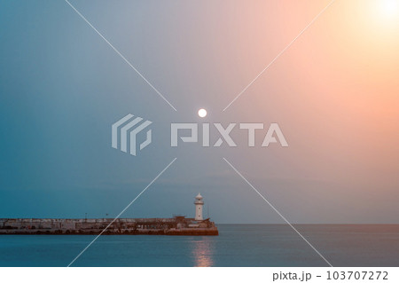 The full moon rises to the lighthouse, the moon path is not the