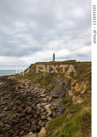 Breathtaking view of coastal scenery lighthouse on rocky cliff under cloudy sky