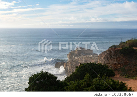 The city of Nazare in Portugal, the symbol of surfing. Coastline and view from above on the town. Tourist place with big waves.