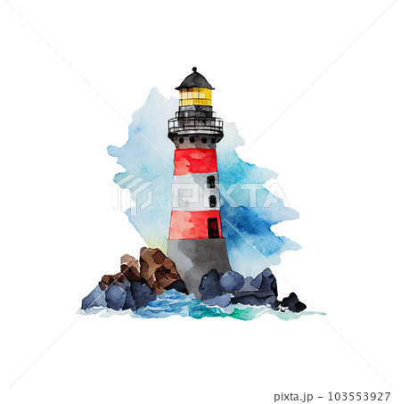 Watercolor lighthouse nautical illustration. Seascape isolated on white