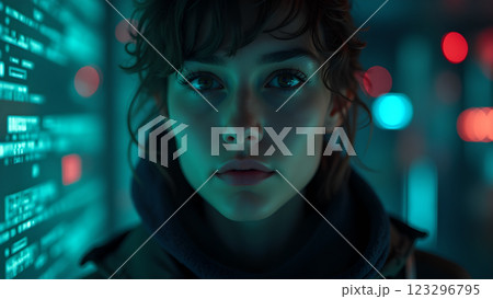 A woman with neon makeup stands in a night party atmosphere, illuminated by colorful lights and bokeh